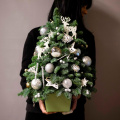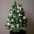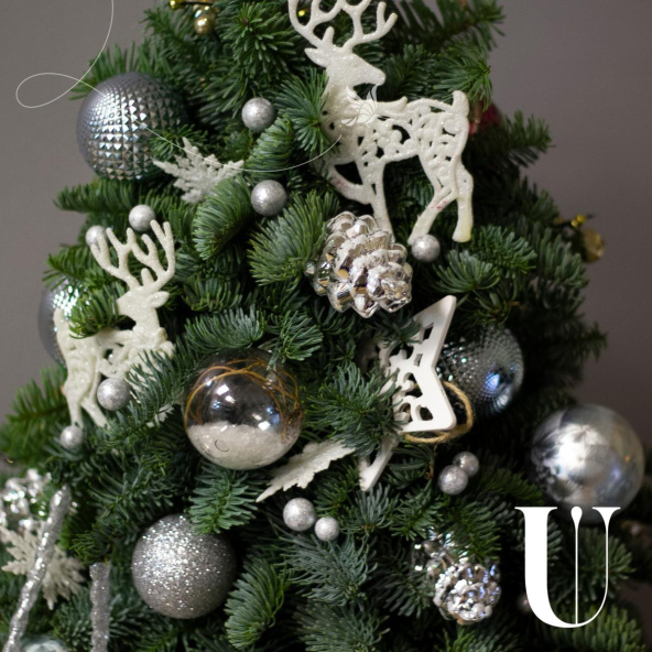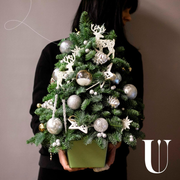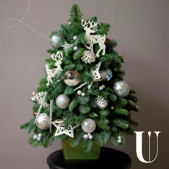 Елочка 50 см из натурального лапника, собранная вручную по веточке нашими флористами. Она идеальной формы и не осыпается. Украшена в бело-серебристой гамме. Могут отсутсвовать Олени