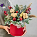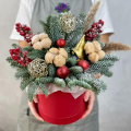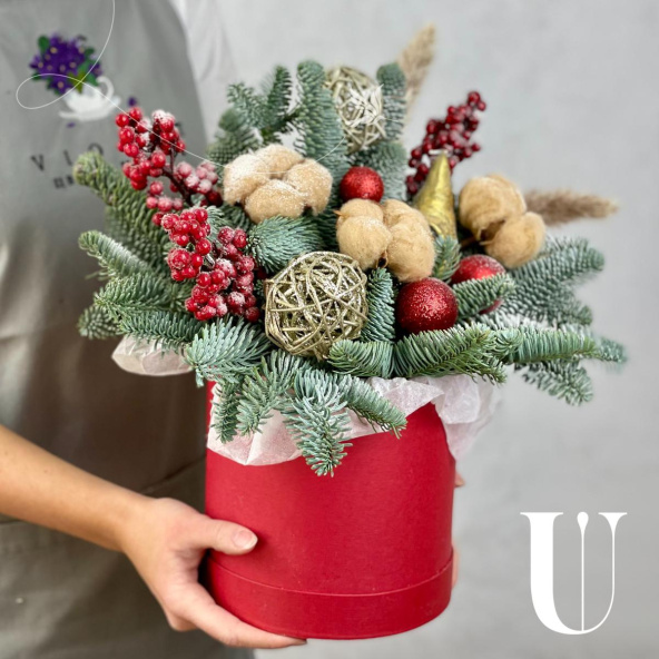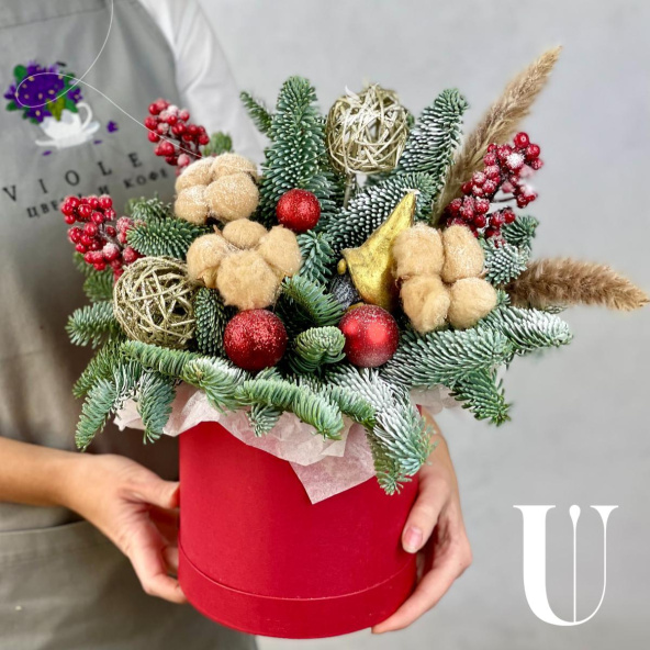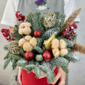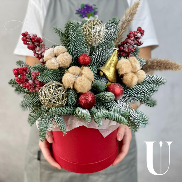 Новогодняя Композиция из живой ели нобилис. Лапник нобилиса отличается высокой стойкостью, он совсем не осыпается а слегка и незаметно подсыхает сохраняя красивый внешний вид. Композиция из такой ели будет радовать Вас больше месяца и простоит все новогодние праздники!