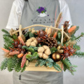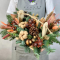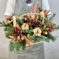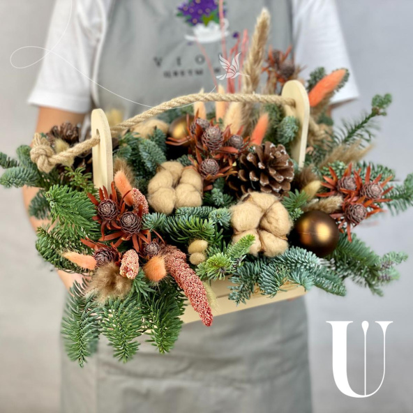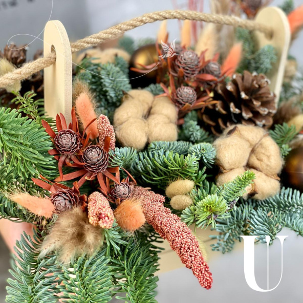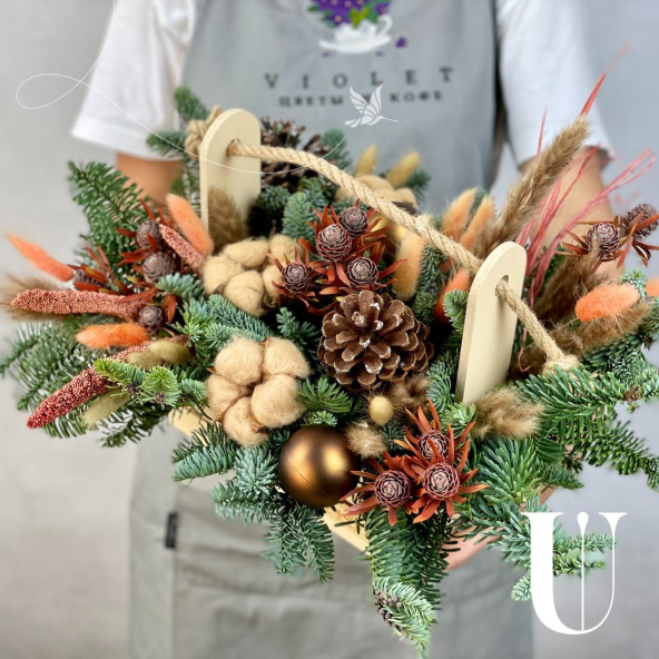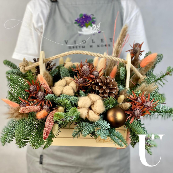 Новогодняя Композиция из живой ели нобилис. Лапник нобилиса отличается высокой стойкостью, он совсем не осыпается а слегка и незаметно подсыхает сохраняя красивый внешний вид. Композиция из такой ели будет радовать Вас больше месяца и простоит все новогодние праздники!