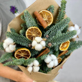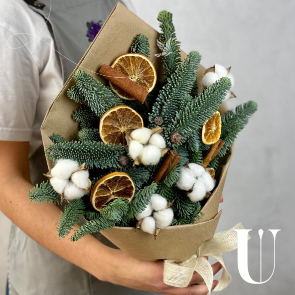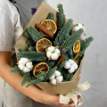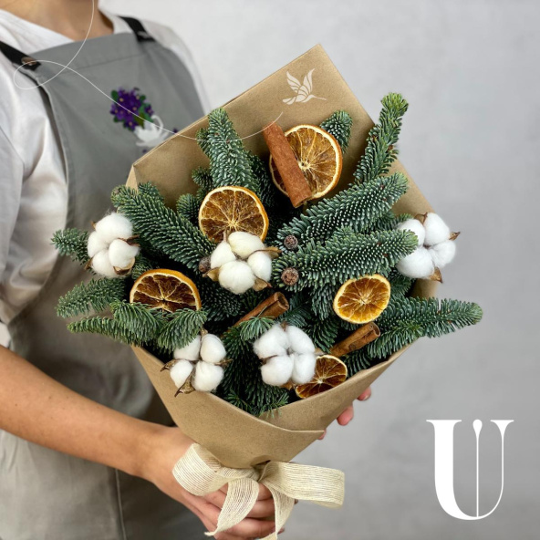 Новогодняя букет из живой ели нобилис. Лапник нобилиса отличается высокой стойкостью, он совсем не осыпается, а слегка и незаметно подсыхает сохраняя красивый внешний вид. Композиция из такой ели будет радовать Вас больше месяца и простоит все новогодние праздники!