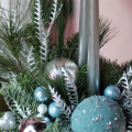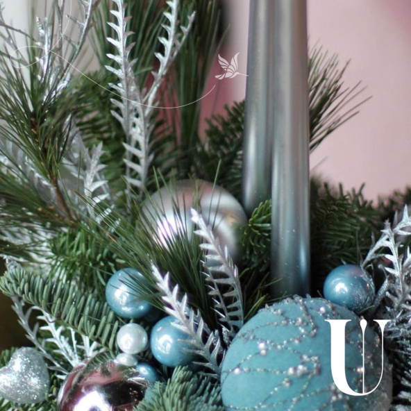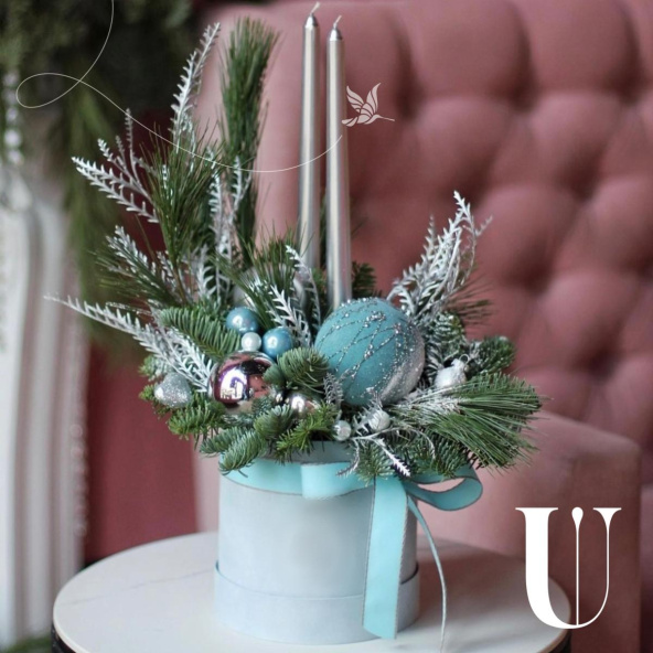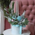 Волшебная новогодняя композиция с серебряными свечами, натуральной хвоей и новогодними игрушками