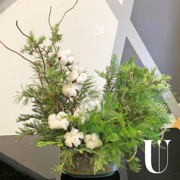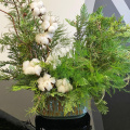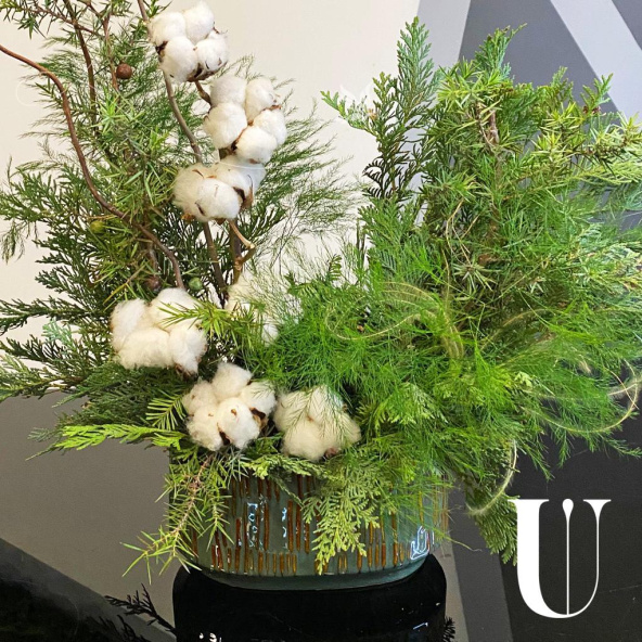 Керамическое кашпо, хлопок, туя, можжевельник, кипарис, стифа, нобилис, ветки ивы