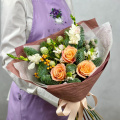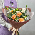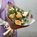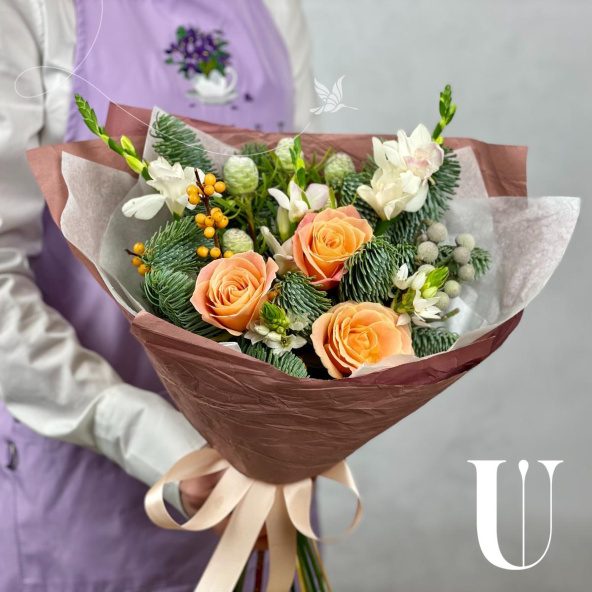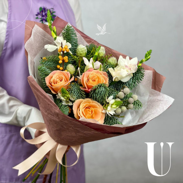 Стильный букет из красных роз Эль Торро и красного гиперикума и корицы