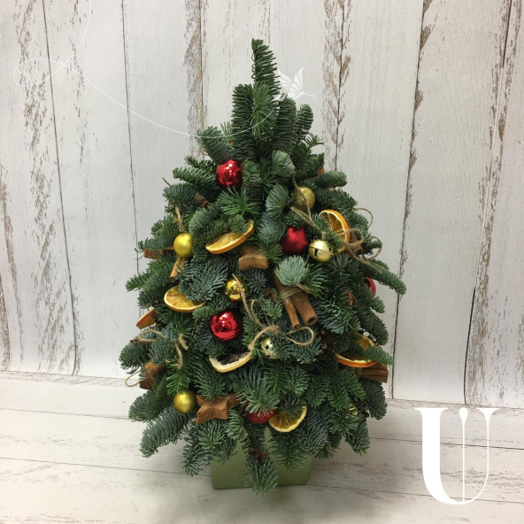 Елочка из натурального лапника, 50 см, собранная вручную по веточке нашими флористами. Она идеальной формы и не осыпаемся. Украшена в красно-золотых цветах
