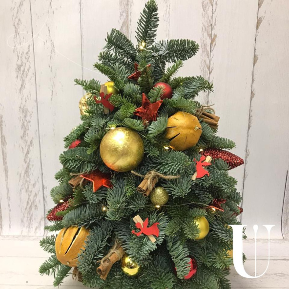 Елочка из натурального лапника, 50 см, собранная вручную по веточке нашими флористами. Она идеальной формы и не осыпается. Украшена в красно-золотых цветах