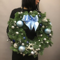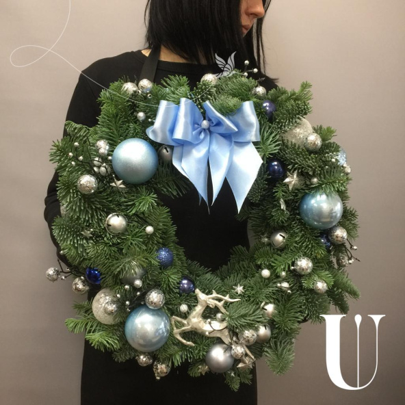 Венок диаметром 39 см, украшен в серебристо-голубой гамме