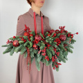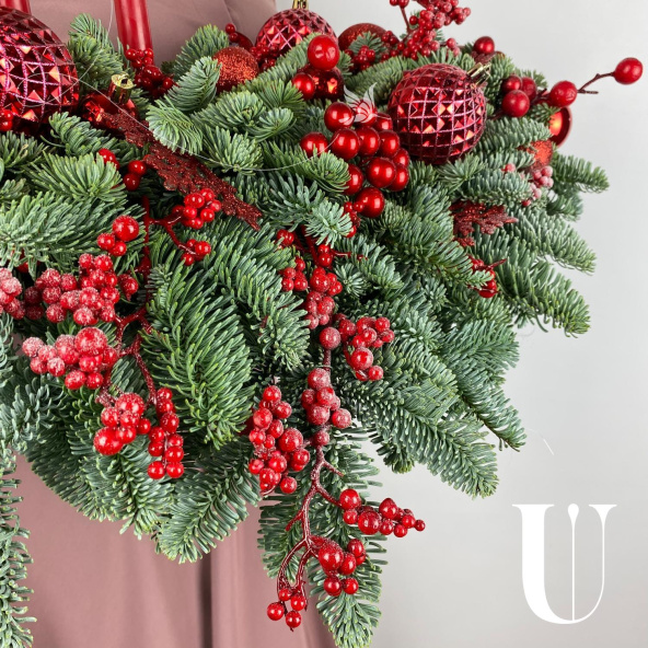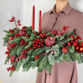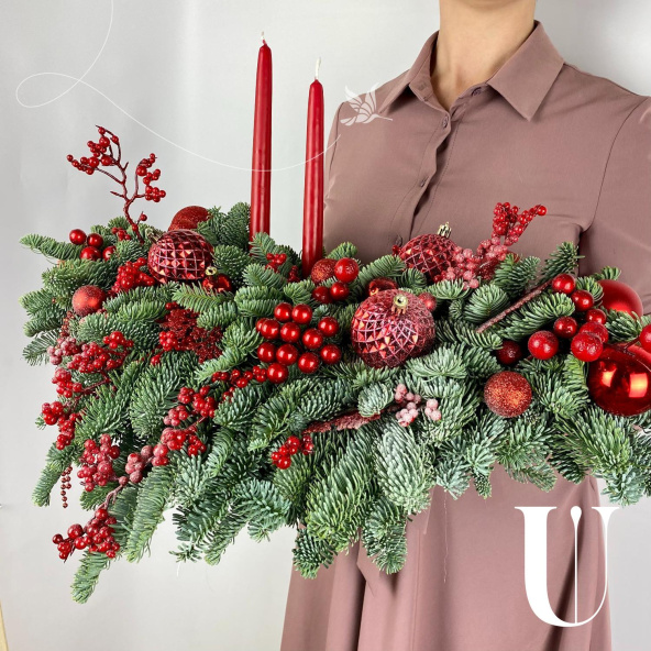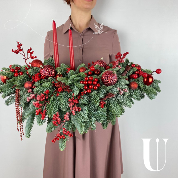 Красивая новогодняя композиция со свечами и свисающими ветками в красных цветах! Благодаря своей форме она прекрасно украсит подоконник, комод, или другие подобные места