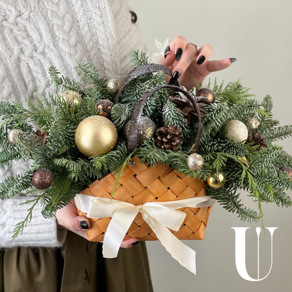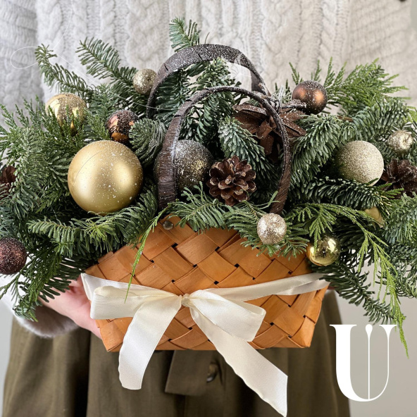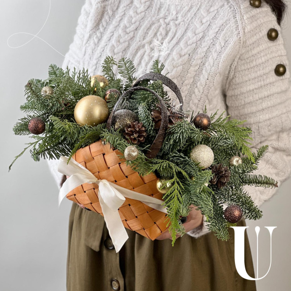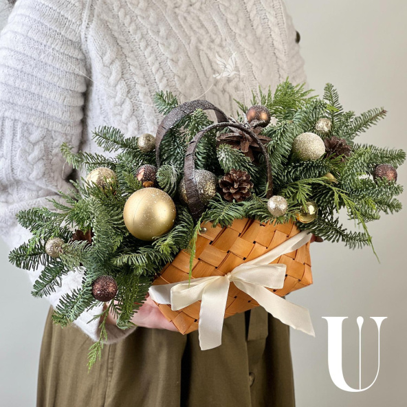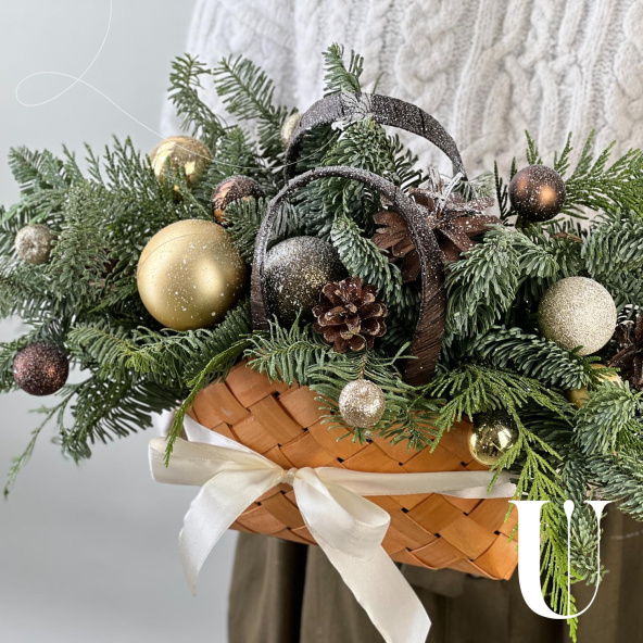 Новогодняя композиция из живой ели нобилис. Лапник нобилиса отличается высокой стойкостью, он совсем не осыпается, а слегка и незаметно подсыхает сохраняя красивый внешний вид. Композиция из такой ели будет радовать Вас больше месяца и простоит все новогодние праздники! Радуйте себя и своих близких!