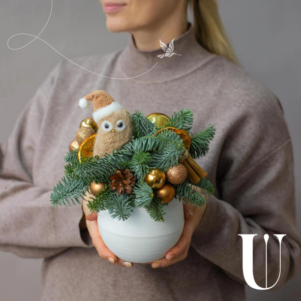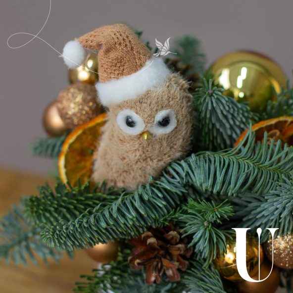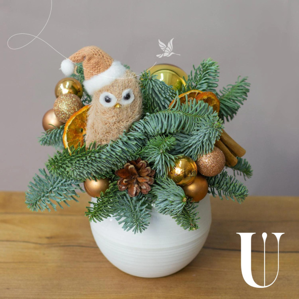 Состав: Нобилис, игрушка сова, дольки апельсина - 3 шт, шишки натуральные - 2 шт, корица - 1 шт, шар бронзовый 2 см микс - 9 шт, шар золотой 4 см - 1 шт.