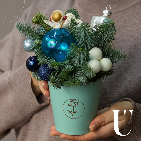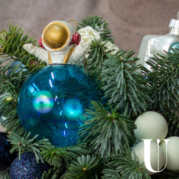 Состав: Нобилис, фигурка космонавт-2шт, шар синий 2 см-4 шт, шар белый 2см-3шт, ротанг белый 1см-5шт, шар голубой 2 см -1 шт, шар голубой 4 см-1шт.