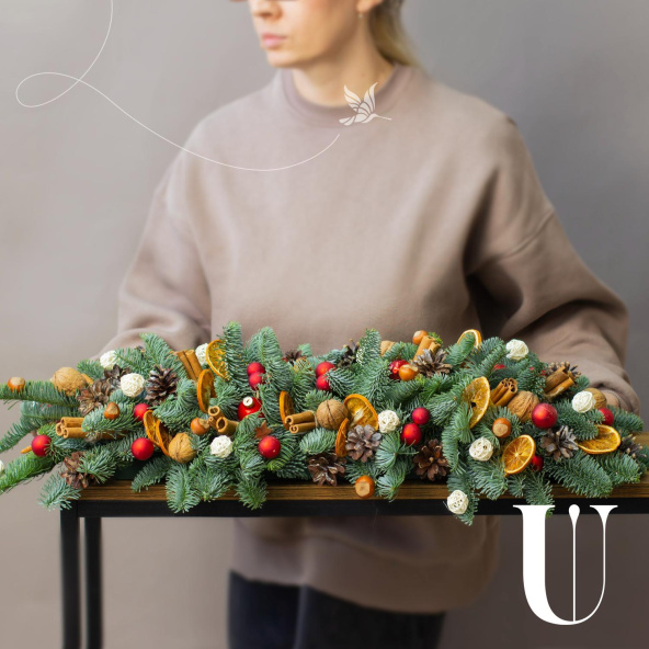 Состав: Нобилис - 1, апельсин дольки - 24 шт, орех грецкий - 9 шт, фундук - 10 шт, шар красный стекло 3,5 см - 3 шт, шар красный стекло 2 см - 27 шт, шар пластик красный 3 см - 5 шт, корица - 30 шт, шишка - 15 шт ,шар плетеный красный и белый - 16 шт.