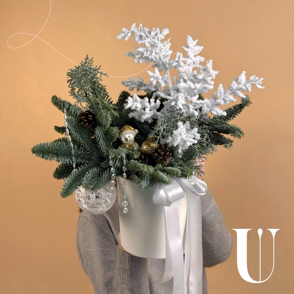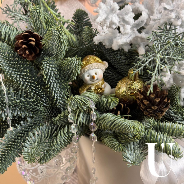 Новогодняя композиция «Морозный лес» — это настоящее произведение искусства, созданное для того, чтобы наполнить ваш дом атмосферой праздника и волшебства. В этой композиции сочетаются изысканность нобилиса, нежность голубого кипариса, забавный снеговичок и яркие новогодние шары.