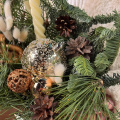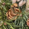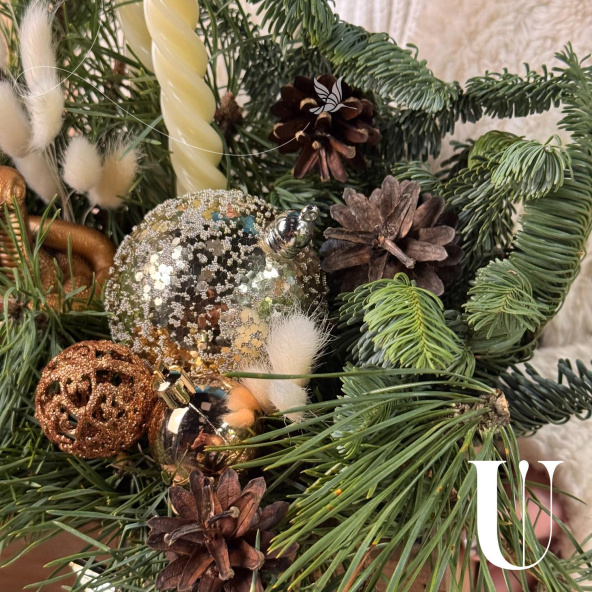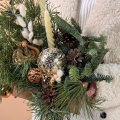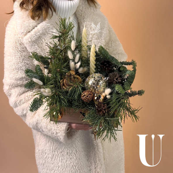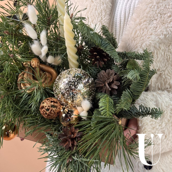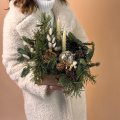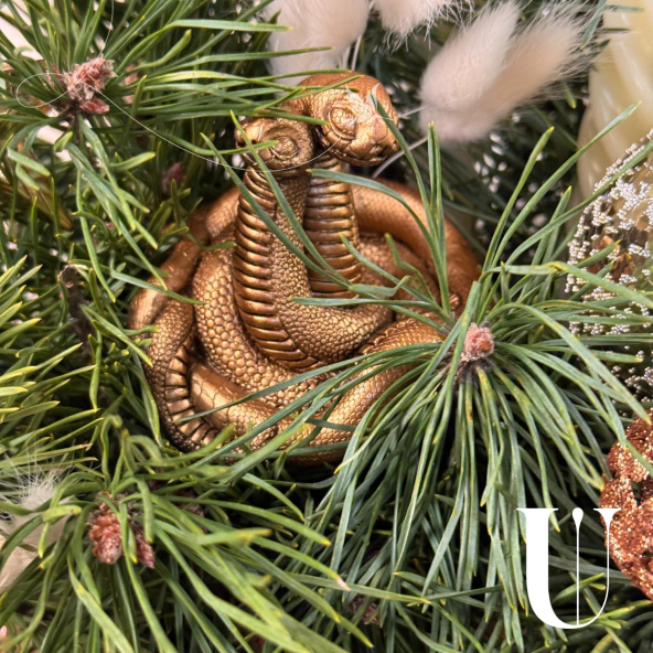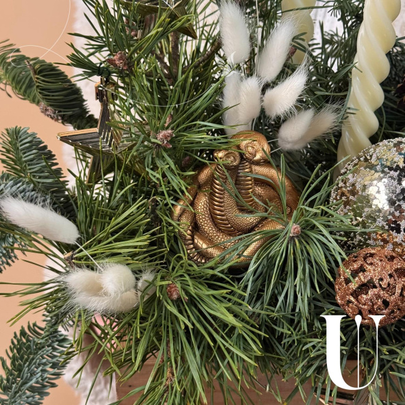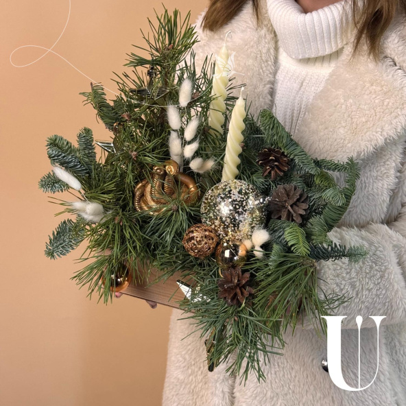 Новогодняя композиция «Уютный вечер» состоит из ветвей нобилиса и сосны, свечей и символа наступающего года — змеи. Это гармоничное сочетание создаёт атмосферу тепла и уюта.
