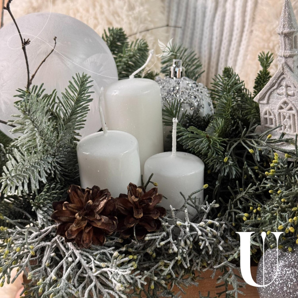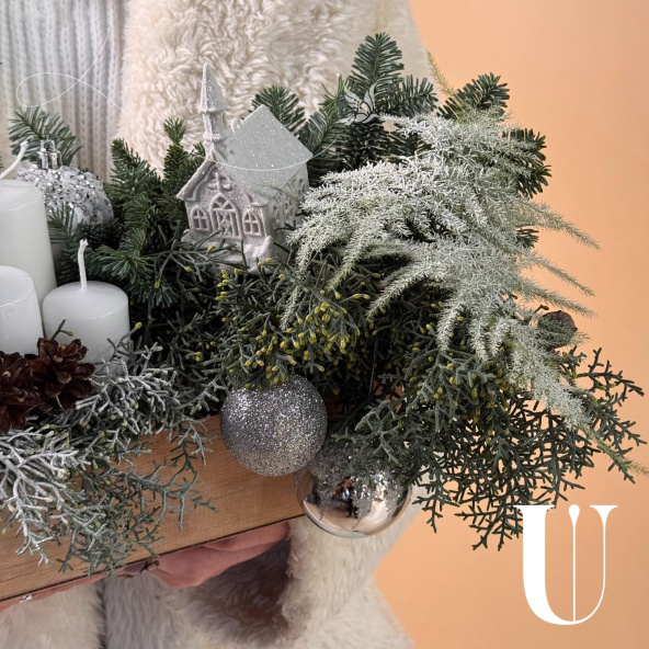 Новогодняя композиция «Зимний Хогвартс» — это настоящее волшебство, созданное из ветвей нобилиса, голубого кипариса и красивых новогодних шаров. Эти элементы гармонично сочетаются, создавая атмосферу зимней сказки.