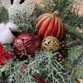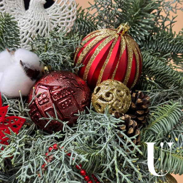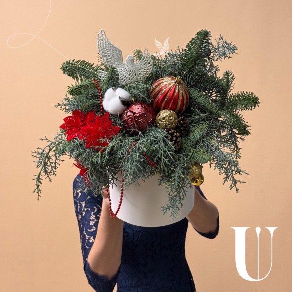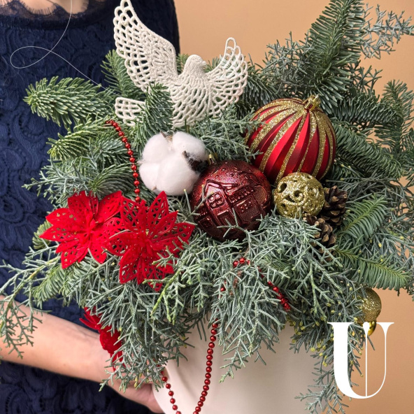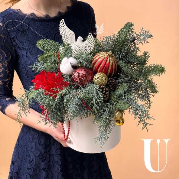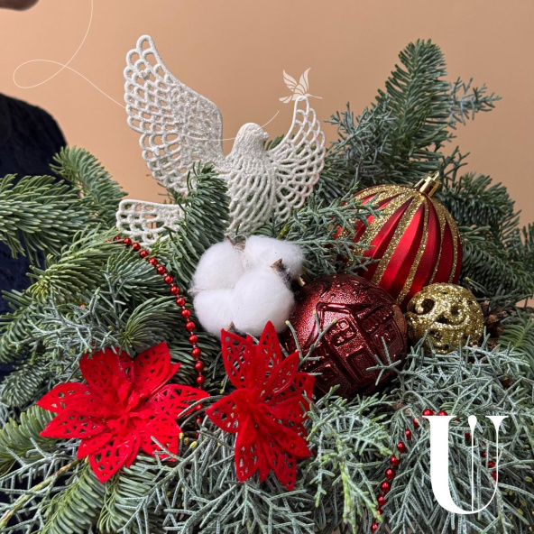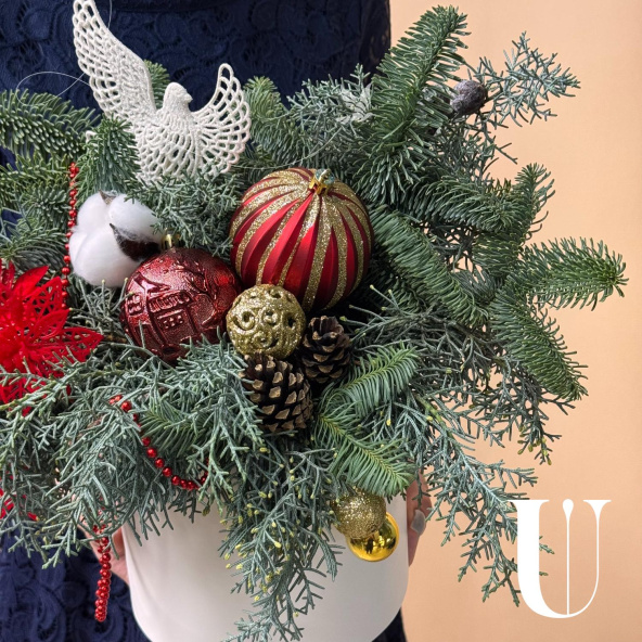 Ветви нобилиса украшают композицию, добавляя ей благородства и свежести. Голубой кипарис, символ чистоты и свежести, придаёт композиции особую элегантность. Фигурка белой голубки, олицетворяющая мир и надежду, добавляет нежности и гармонии, а разноцветные новогодние шары, украшающие композицию, создают атмосферу праздника и радости.