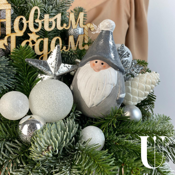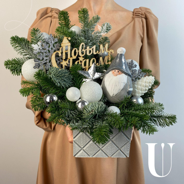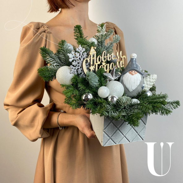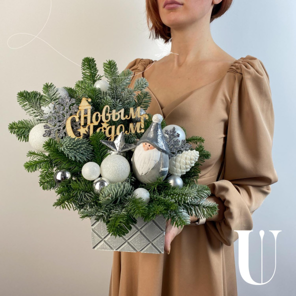 Новогодняя композиция в деревянном ящике в бело-серебристой гамме! Украсит ваш дом и станет прекрасным подарком вашим близким!