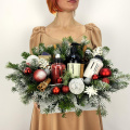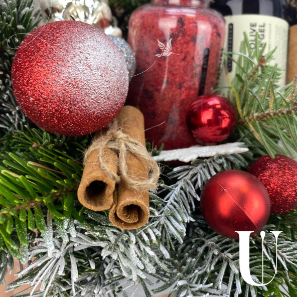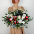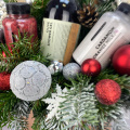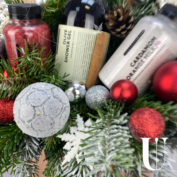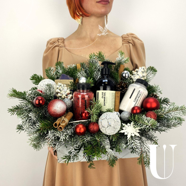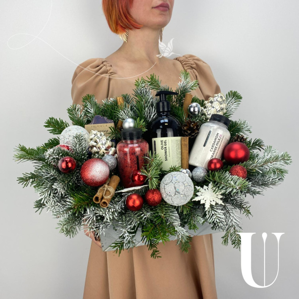 Новогодний подарочный набор с уходовыми средствами для ванны и душа. Набор собран в деревянном ящике из живой датской ели (нобилиса) и новогоднего декора.