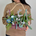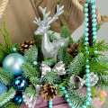 Букет из нобилиса, синих и серебряных игрушек в упаковке