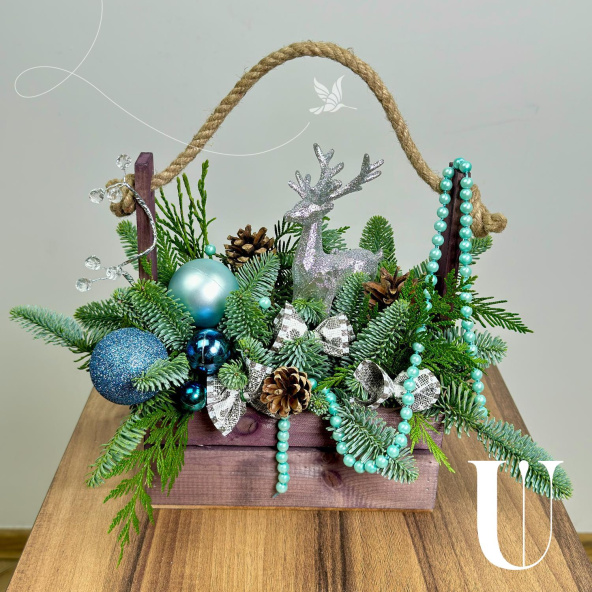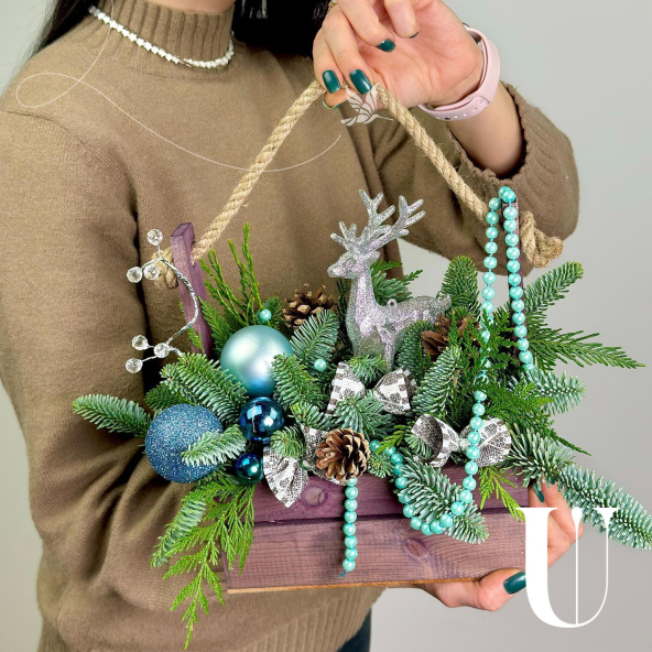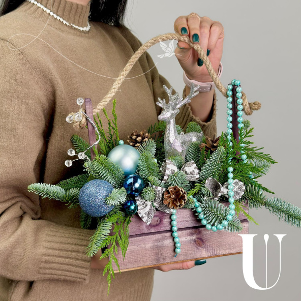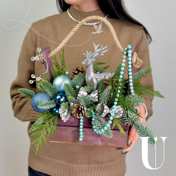 Новогодняя композиция из нобилиса и бело-серебристого декора в ящике