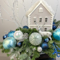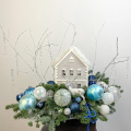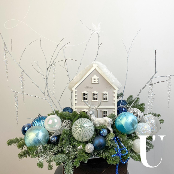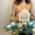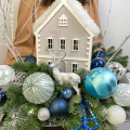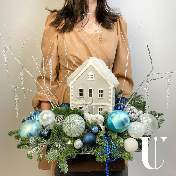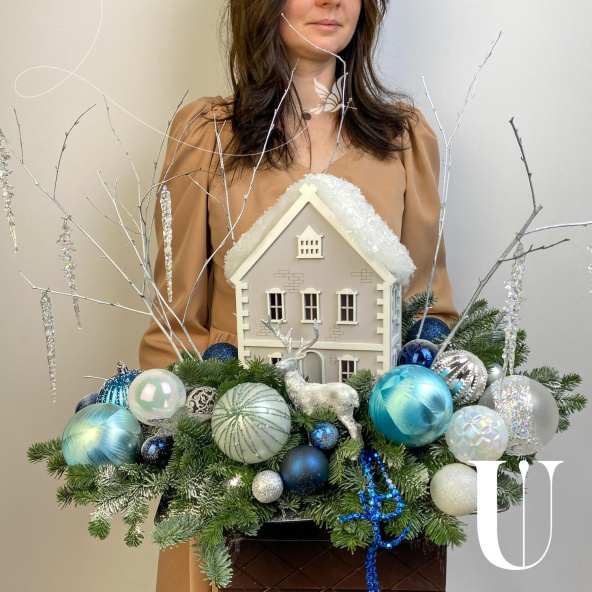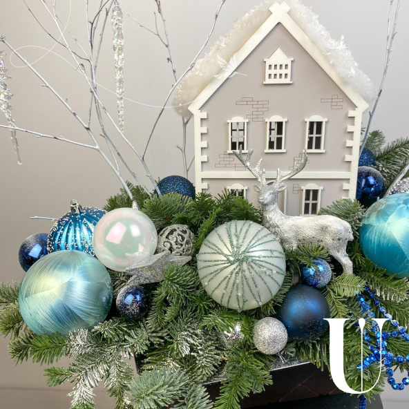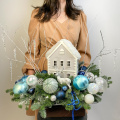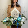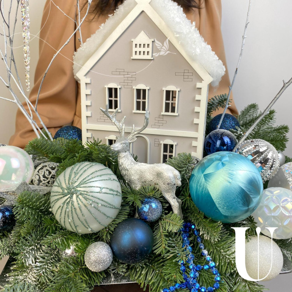 Новогодняя композиция с очаровательным деревянным домиком, и другим новогодним декором! Новогодняя сказка расположилась на серебристом подносе. Украсит ваш дом и станет прекрасным подарком вашим близким!