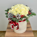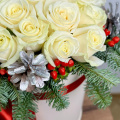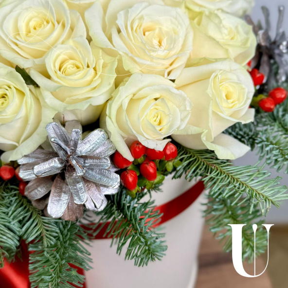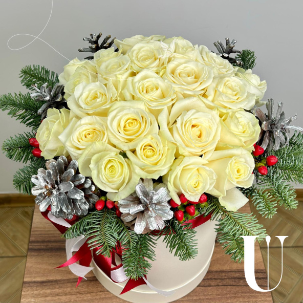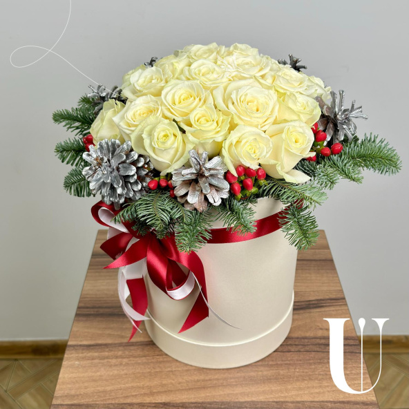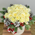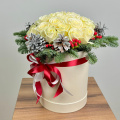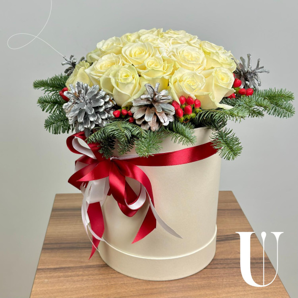 Зимняя композиция в шляпной коробке, с розами и хвойными веточками.