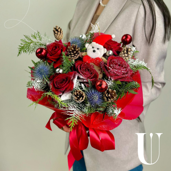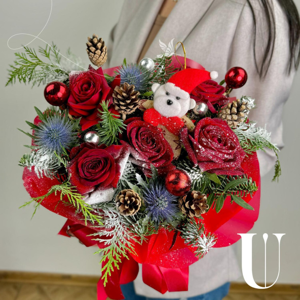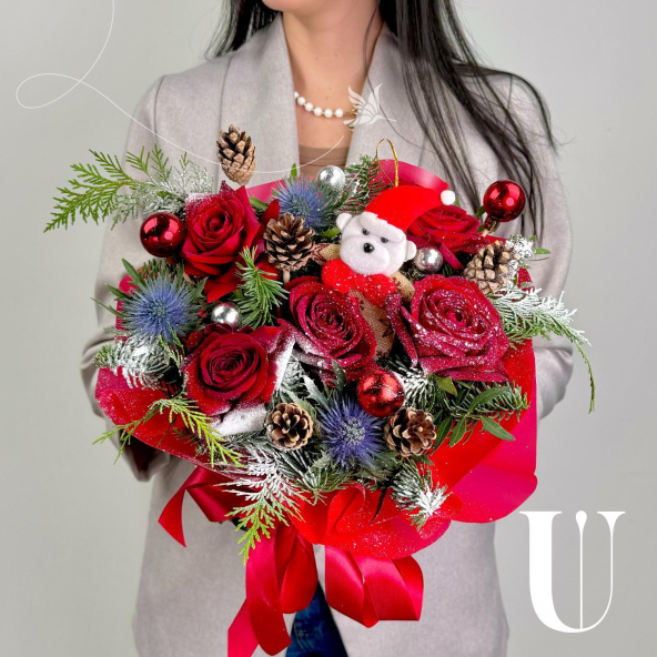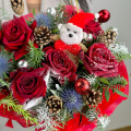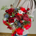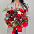 Композиция собрана на флористической губке, упакована в красную декоративную пленку.