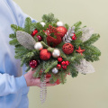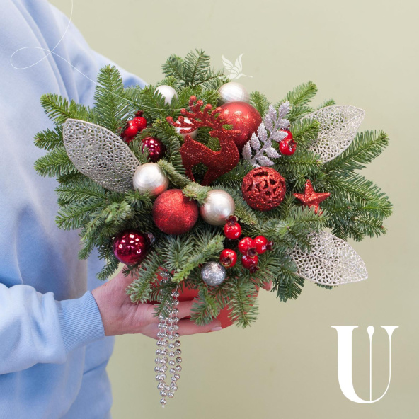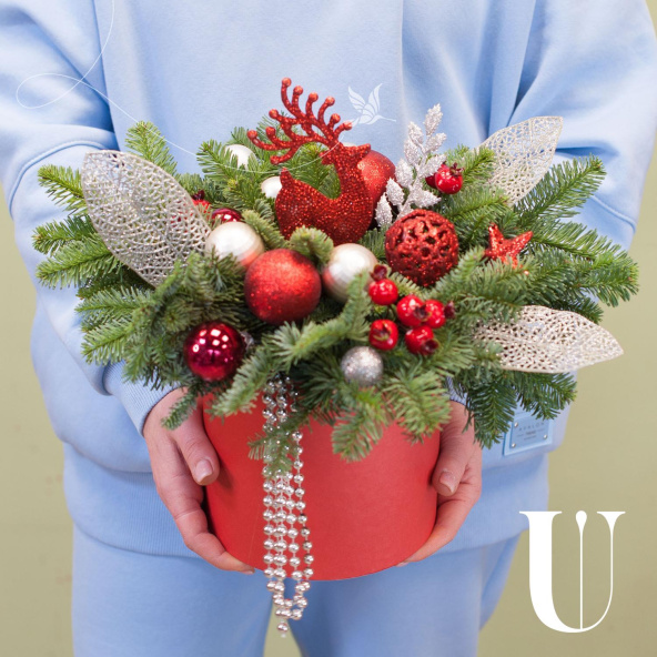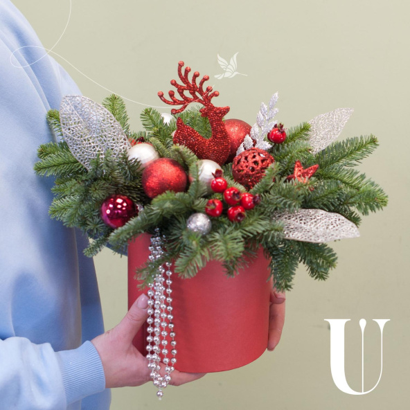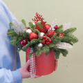Композиция выполнена в красном цвете, что придает ей яркость и насыщенность. В составе композиции - шляпная коробка с еловым лапником и новогодними игрушками, что создает атмосферу праздника и уюта.
