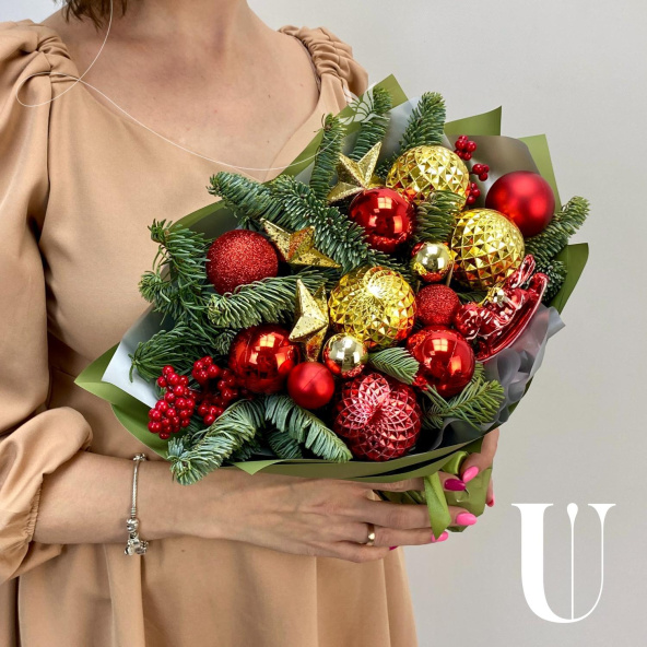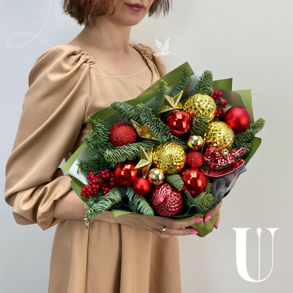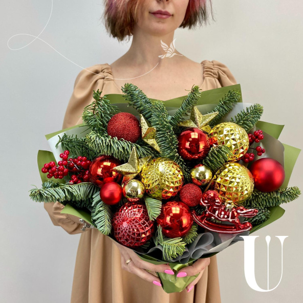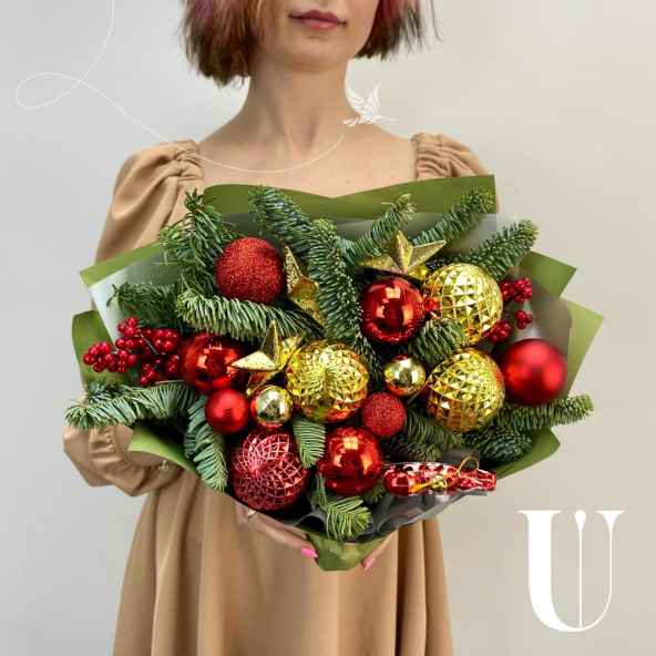 Композиция из нобилиса и новогодних игрушек в упаковке