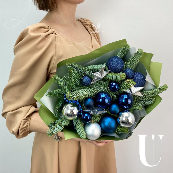 Сине-золотой новогодний букет из нобилиса и игрушек в упаковке