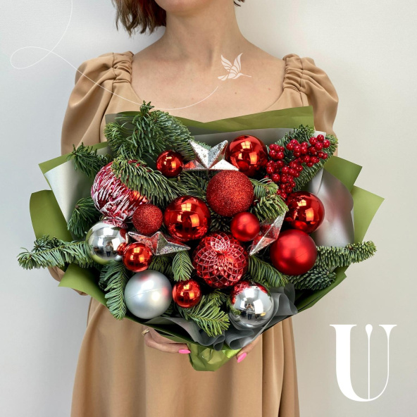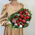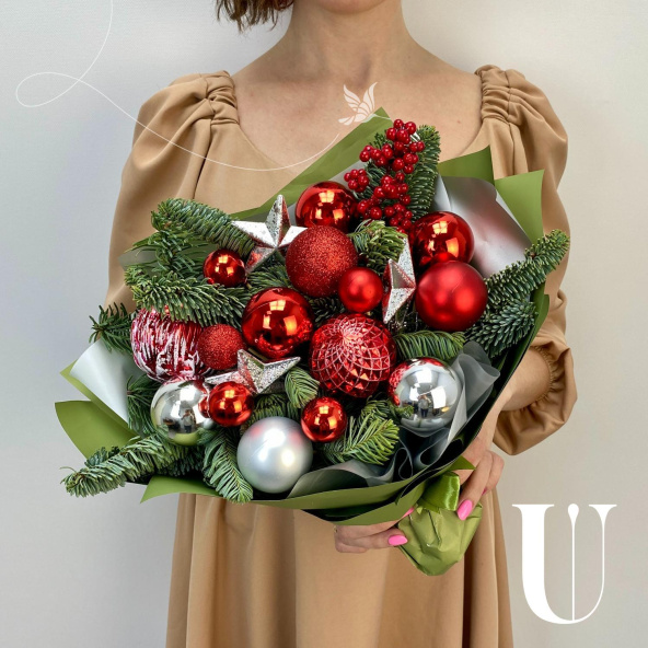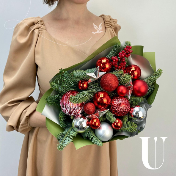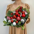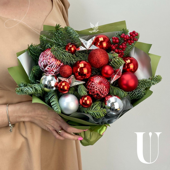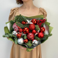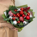 Букет из нобилиса, синих и серебряных игрушек в упаковке