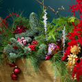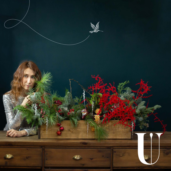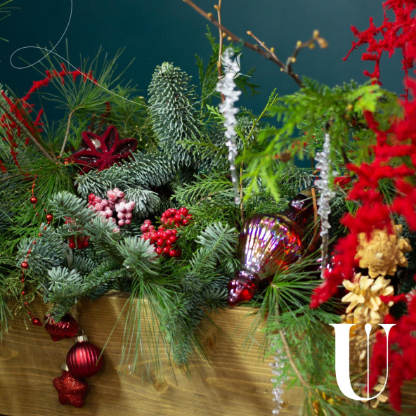 Эффектная новогодняя композиция, в которой сочетаются насыщенные красные акценты и живая хвоя, словно сошедшая со страниц зимней сказки. Она создаёт ощущение праздника, уюта и волшебства, наполняя интерьер теплом и светом. Идеально подойдёт для украшения кухонной, каминной зоны или витрины. Эта композиция станет выразительным центром новогоднего декора и подарит настоящее рождественское настроение.