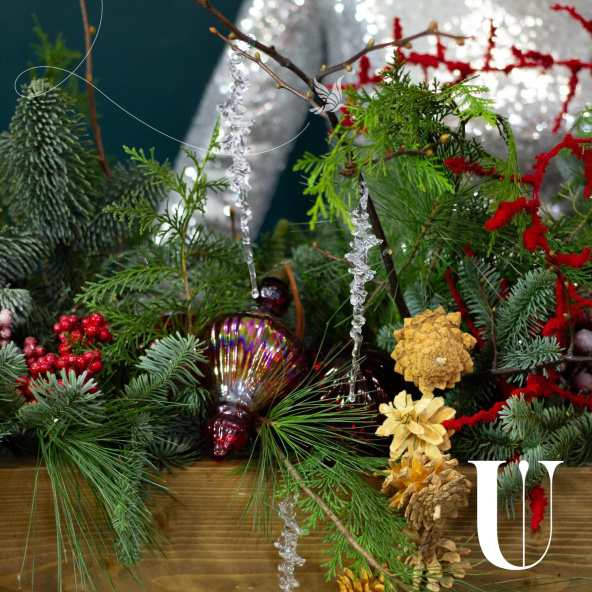 Состав: нобилис, сосна, туя, можжевельник, аспарагус красный, шишки натуральные, новогодний декор