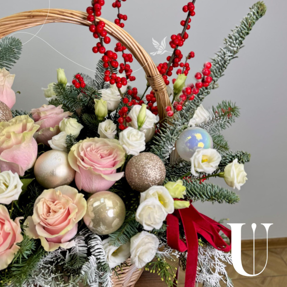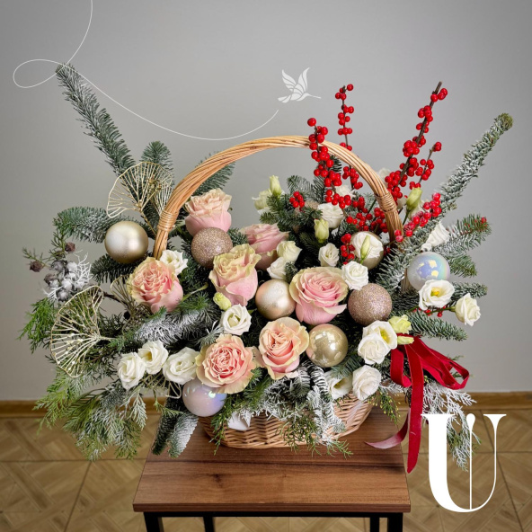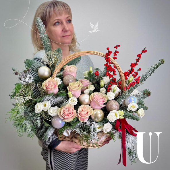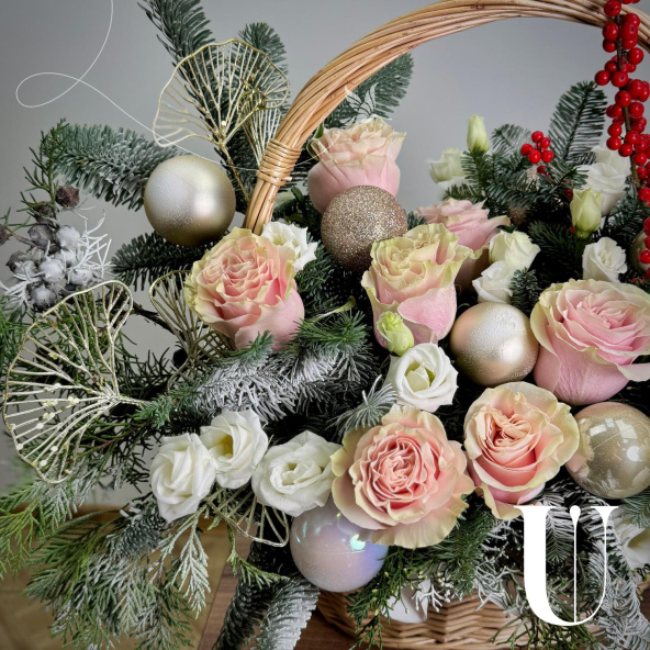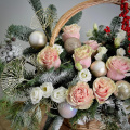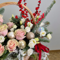 Новогодняя композиция из нобилиса, магнолии и игрушек в коробке