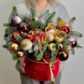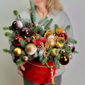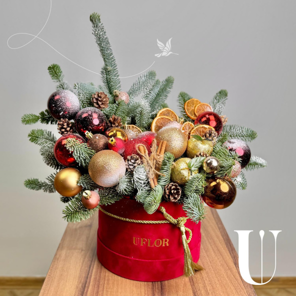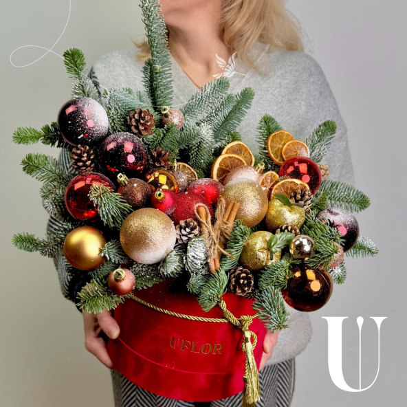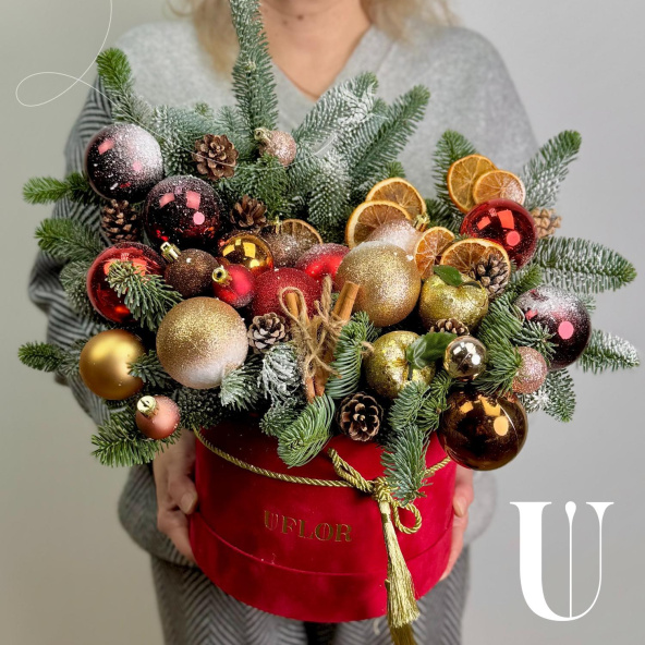 Сочная яркая новогодняя композиция в шляпной коробке.