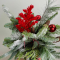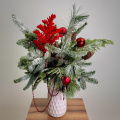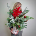 Композиция из роз Ред Наоми, хвои и новогодних игрушек