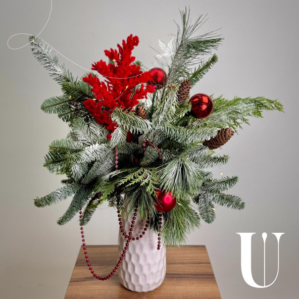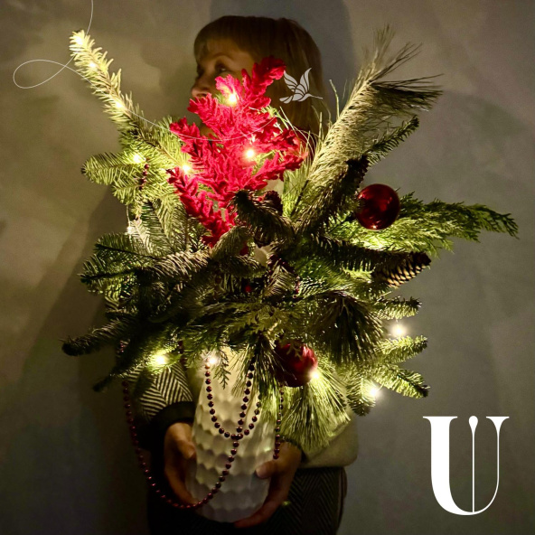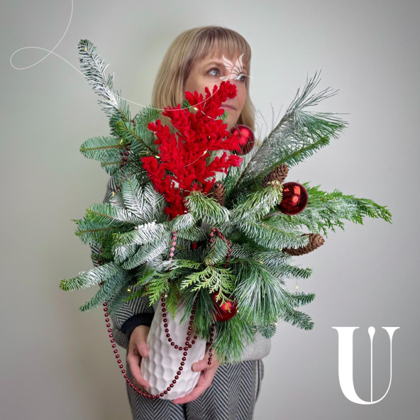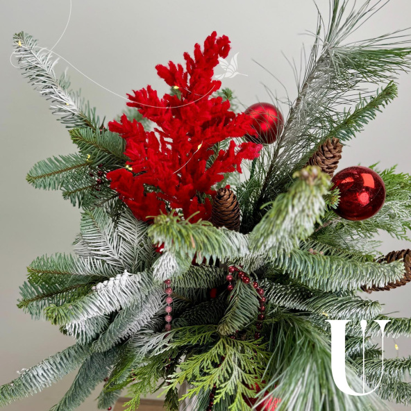 Новогодняя композиция из можевельника, нобилиса, шишек и шаров