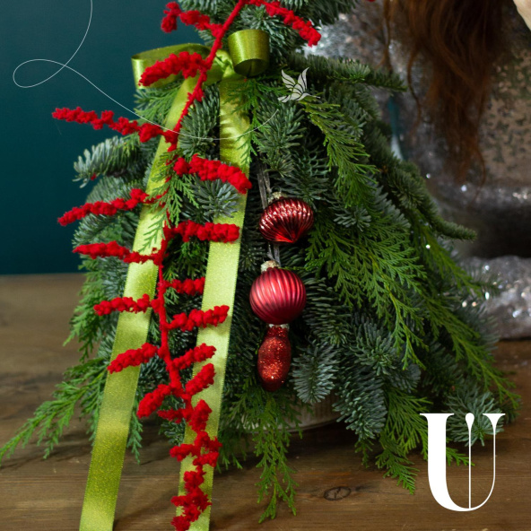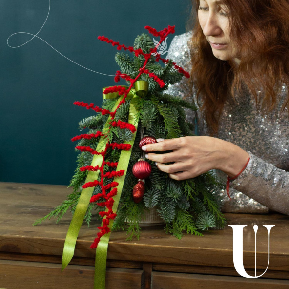 Эта миниатюрная ёлочка — словно тихое волшебство, которое поселяется в доме в преддверии Рождества. Насыщенная хвоя, акценты красного декора и аккуратные детали создают ощущение уюта и тепла, как от огоньков в окне зимним вечером. Она идеально подойдёт для украшения стола, каминной полки или прикроватной тумбы. Композиция не требует ухода и долго сохраняет свежий праздничный вид. Прекрасный вариант небольшого, но очень душевного подарка.