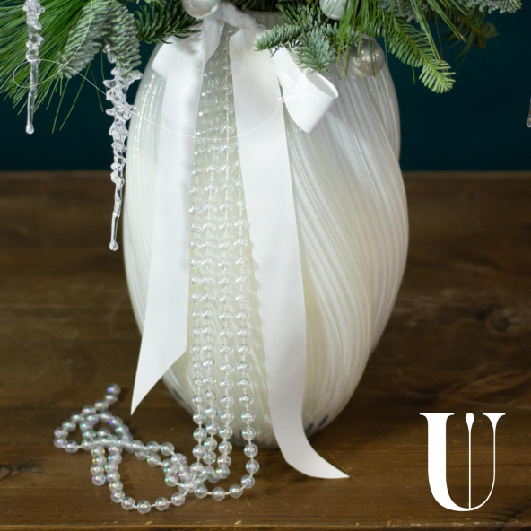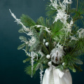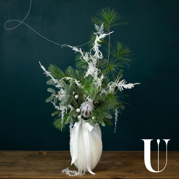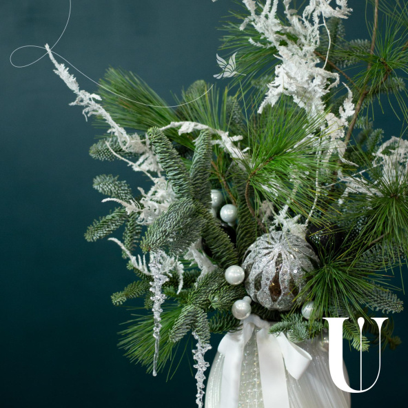 Эта композиция наполнена ощущением мягкого зимнего света, когда день незаметно растворяется в вечере. Холодная зелень хвои переплетается с светлыми акцентами, создавая ощущение спокойствия и уюта. Она словно приглашает замедлиться, зажечь свечи и насладиться тишиной зимнего дома. Идеально подойдёт для интерьера, где ценят сдержанную элегантность и природную гармонию. Такая работа станет ненавязчивым, но выразительным акцентом новогоднего декора.