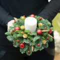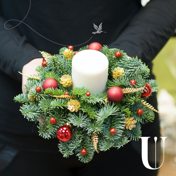 Небольшая новогодняя композиция в красно-золотой гамме с новогодним декором и свечей