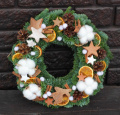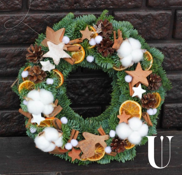 Нобилис 2 шт, хлопок - 4шт, шишка натуральная (диаметр 4 см) - 7шт, декоративная игрушка "заяц" кокос - 1шт, звезда белая кокос (диаметр 4 см) - 1шт, звезда натуральная (диаметр 4 см) - 3шт, звезда натуральная (диаметр 2 см) - 4шт, звезда белая (диаметр 2 см) - 3шт, апельсин деокративный - 13шт, корица (половинками) - 8шт, снег белый (диаметр 1см) - 16шт