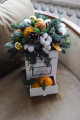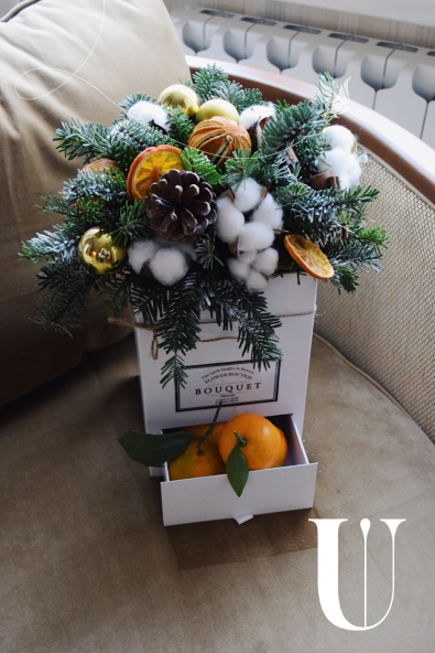 Хвоя, сушенные мандарины, хлопок, шишки в белой коробке с ящиком