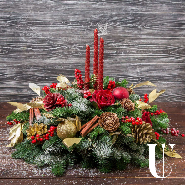 Декоративная композиция из еловых ветвей, свечей и пуансетии