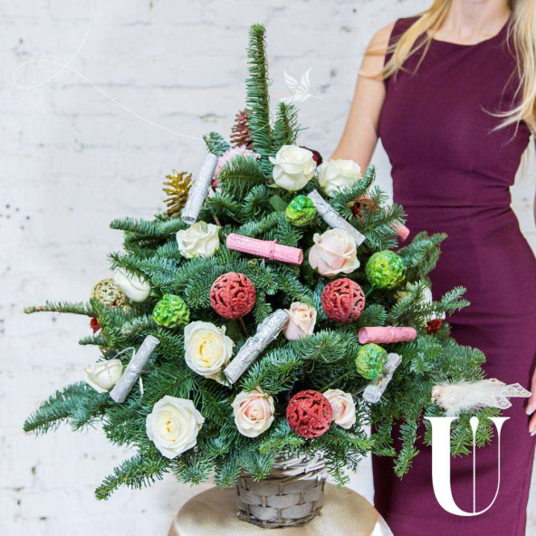 Нобилис (лапник - живые ветви ели), розы, игрушки-украшение, флористическая губка, декор