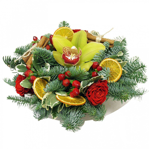 Роза Эль-Торо 3 шт., Орхидея 1 шт., Гиперикум 1 шт., Питтоспорум 1 шт