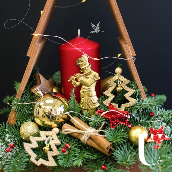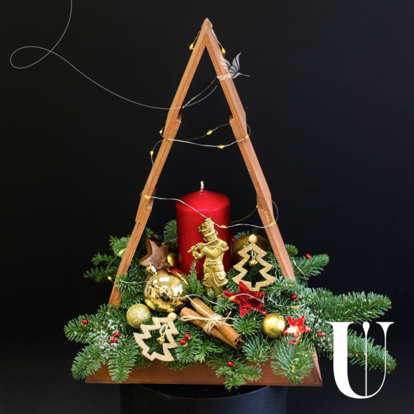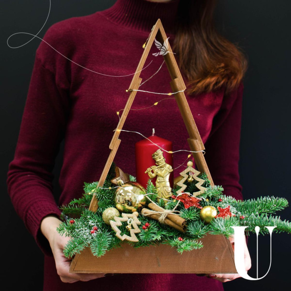 Нобилис, свеча, гирлянда cветодиодная ( батарейки входят в комплект ), новогодний декор, оазис, ящик деревянный в форме елочки, илекс. ( Декор может незначительно отличаться с сохранением цветовой гаммы.)