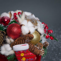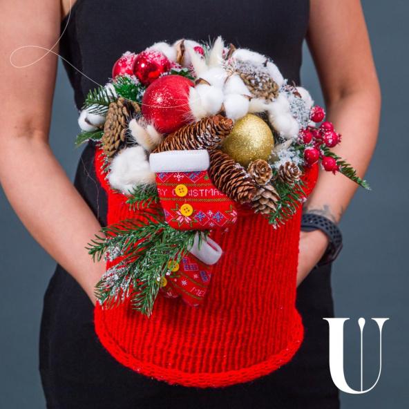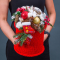 Хлопок, шишки, шары, ветви нобилиса, декор, вязаный чехол красный, шляпная коробка 18*20 см