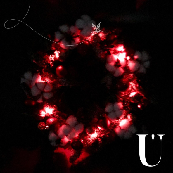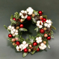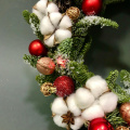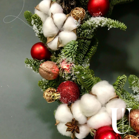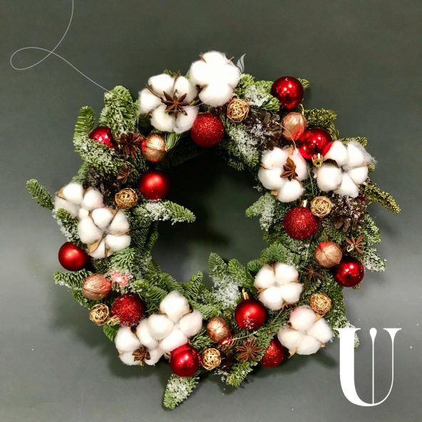 Новогодний букет из роз Ред Наоми, хлопка и нобилиса в красной упаковке