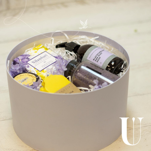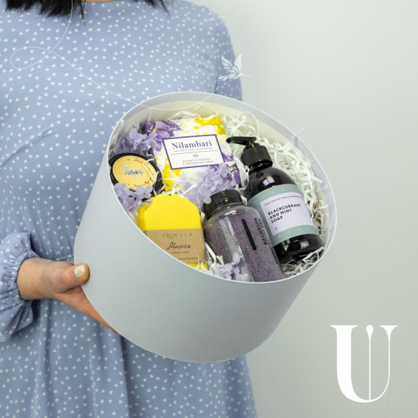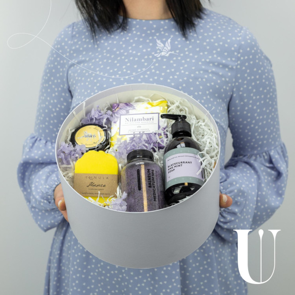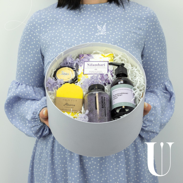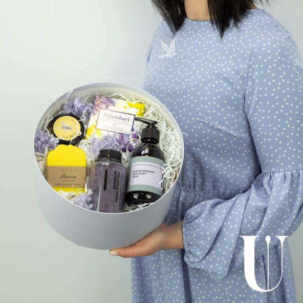 - Коробка круглая голубая, крышка розовая (выс. 15 см, диам. 25 см) - 1 шт