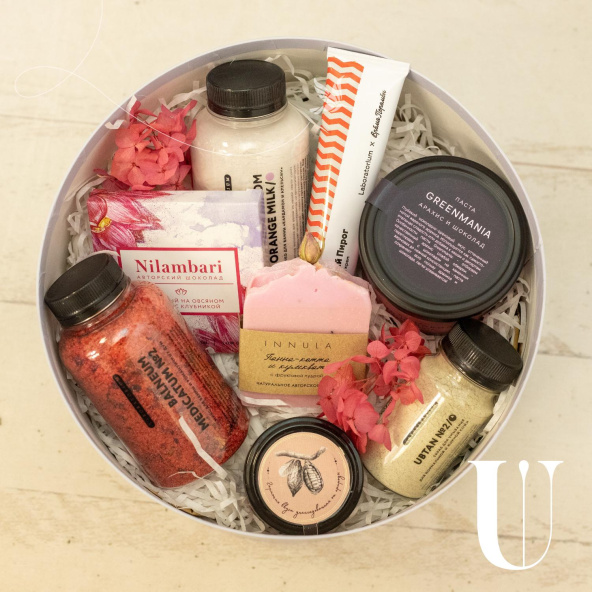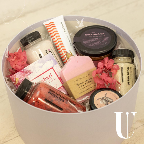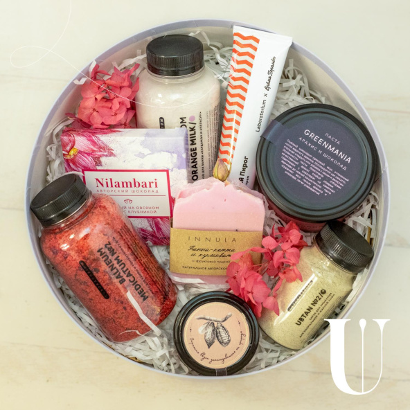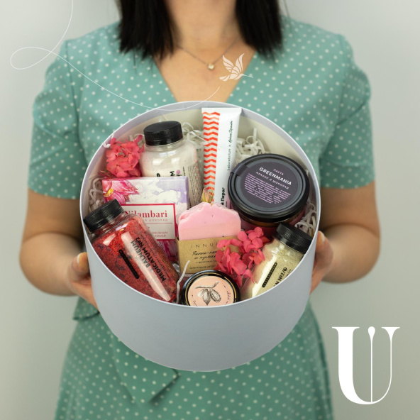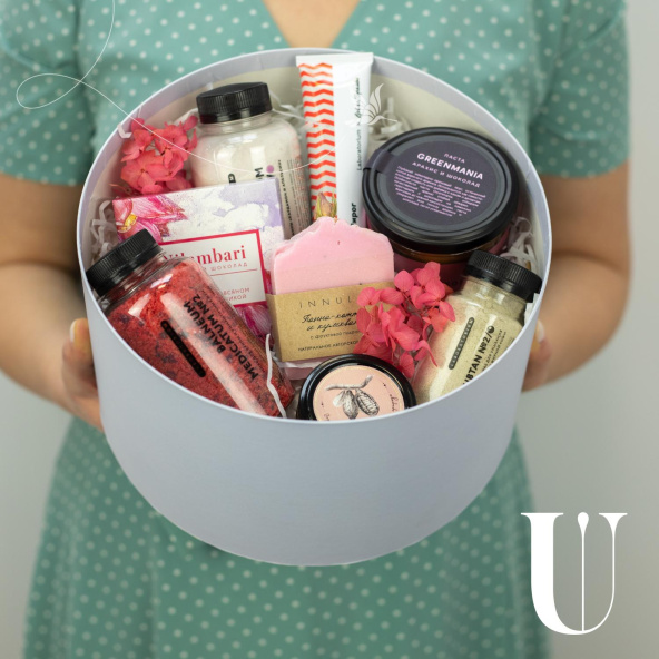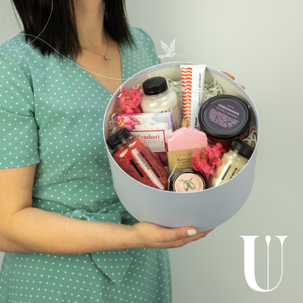 - Коробка круглая голубая, крышка розовая (выс. 15 см, диам. 25 см) - 1 шт