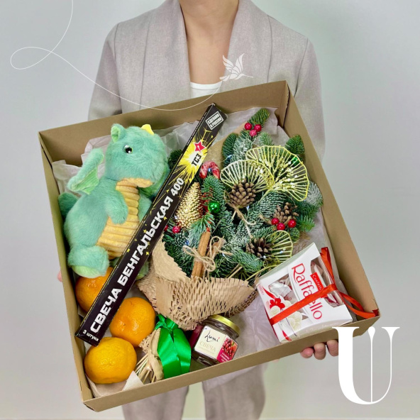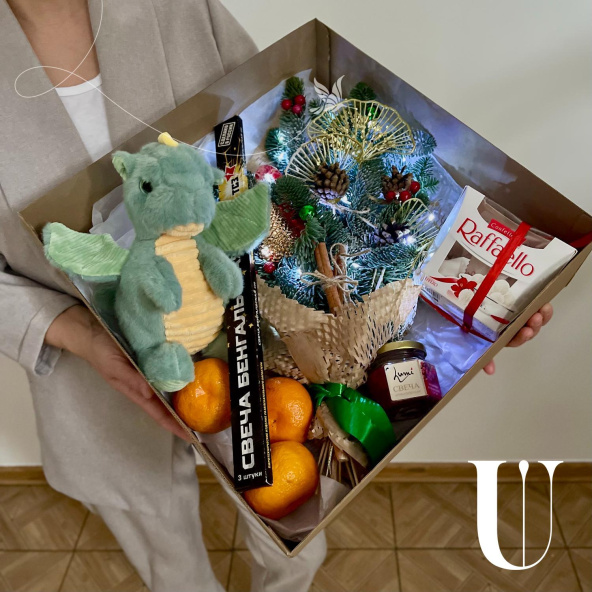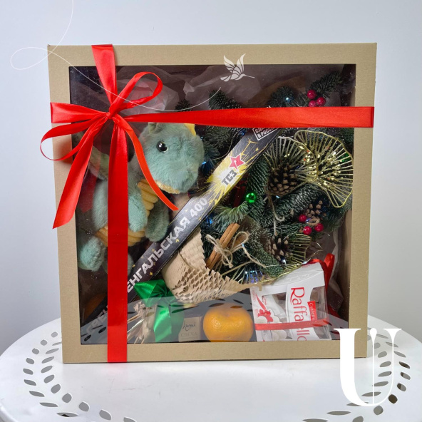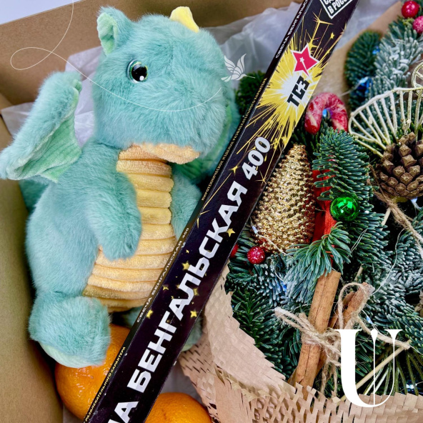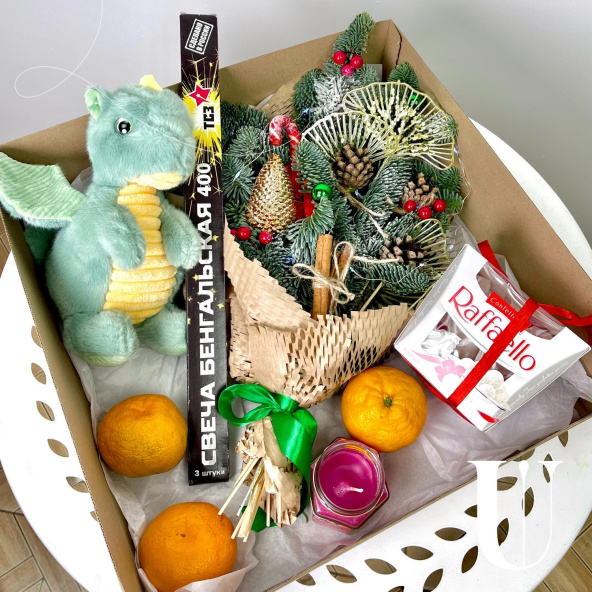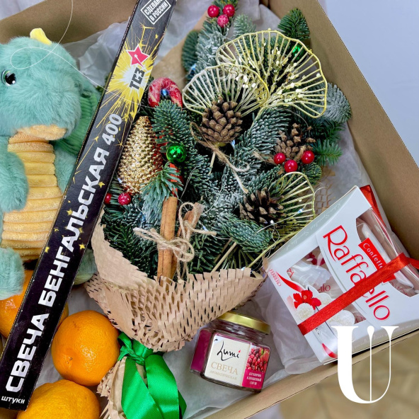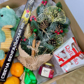 - Букетик еловый с огнями 47*30 см. (еловые веточки, новогодние игрушки 4 шт., огоньки 1 шт., блестящая веточка - 1 шт., шишки мини 3 шт., леденец трость 1 шт., корица 2 шт., красные ягодки, упаковка декоративный крафт, лента)